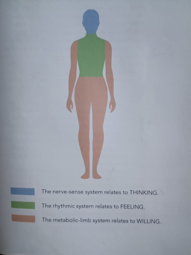 • Pink: limbs – metabolic limb system which is the WILLING sense. Our will creates movement and when we move we generate warmth and metabolic processes.